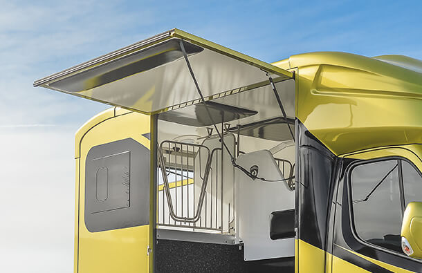 Přístupný z koňského prostoru. Náklad je chráněn bezpečnostní síťkou.