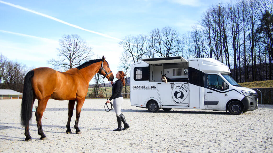 Při pohledu do kamery jsem ocenila stabilitu, kterou cesta v autě oproti přívěsu mému koni nabídla. Valentino je zvyklý na opatrnou jízdu, jíž navzdory občas ve vozíku předvádí různorodé vratké kreace. Dodávka mu poskytla komfortnější cestu s jednodušším vyvažováním, díky níž po hodině a půl dojel na místo určení svěží a připravený na výkon.