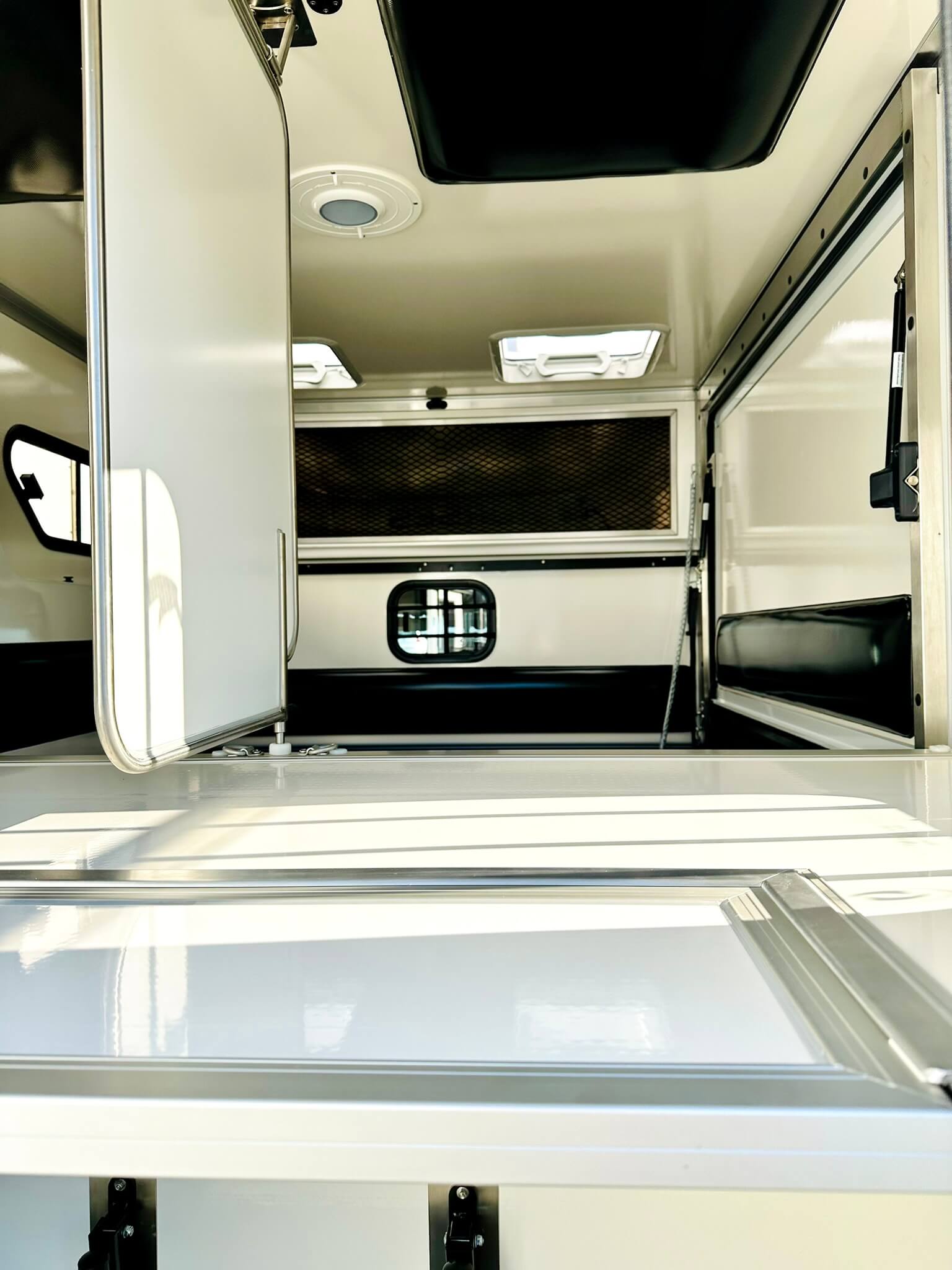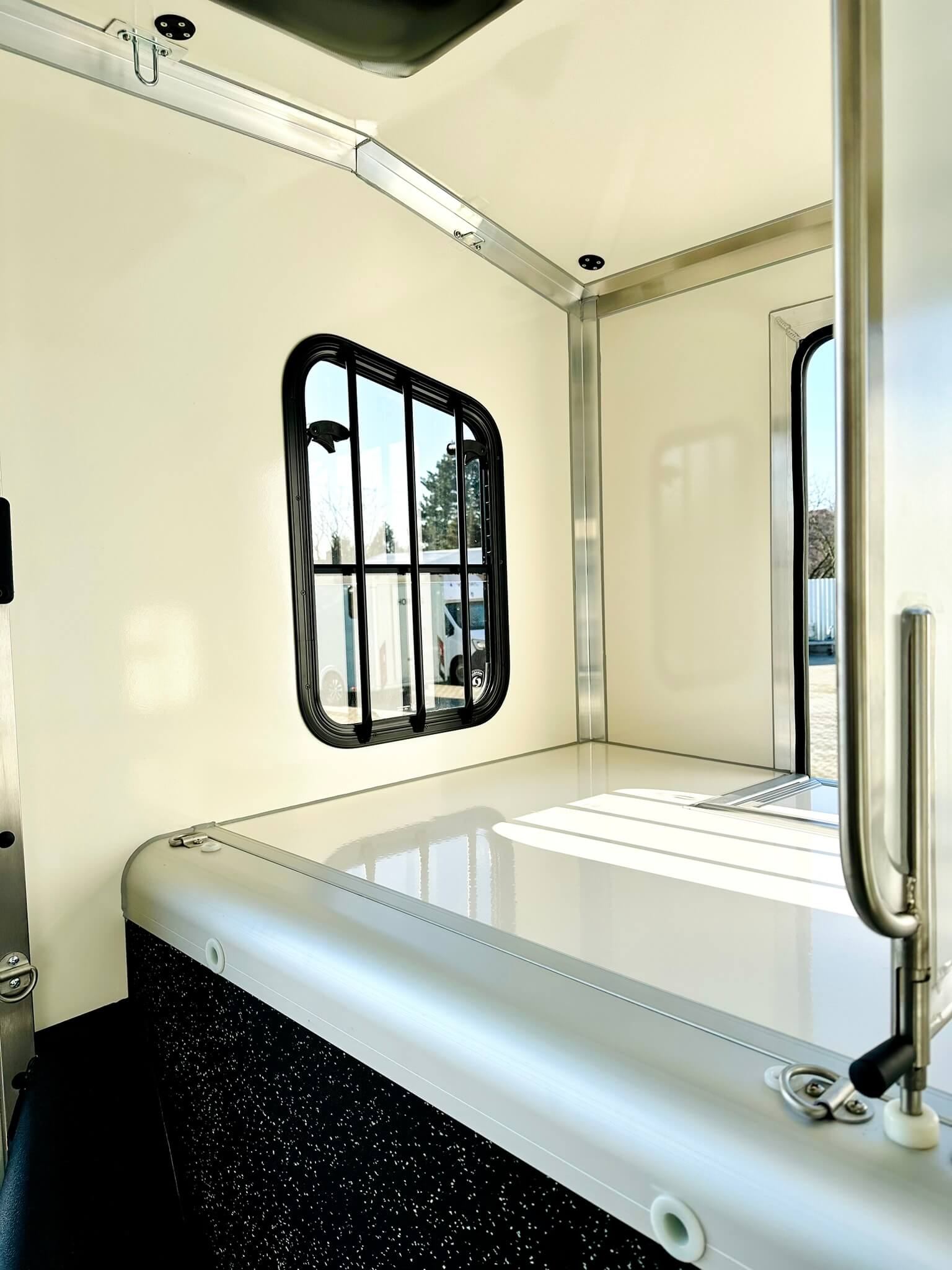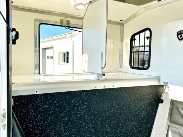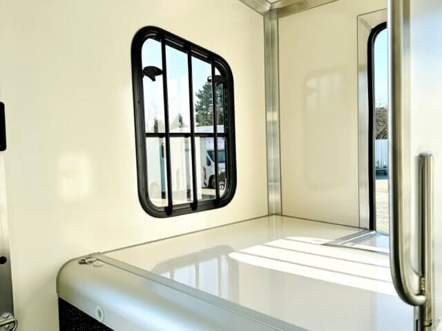 Okno posuvné s mříží mezi kabinou a prostorem pro koně
